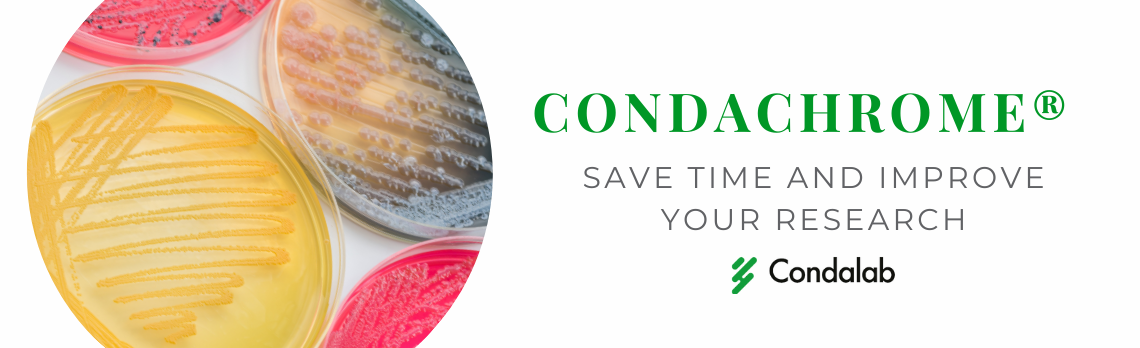 Discover CondaChrome®, a line of chromogenic media produced by Condalab that will improve the accuracy of results in your laboratory. The culture media products have a colourless chromogenic substrate in their composition from the specific enzymatic activity of each microorganism. A part called the chromophore is realised to give the colony an intense and specific colour that makes it possible to identify the bacteria instantly. This culture media offers a series of advantages to save time in identifying your crops.