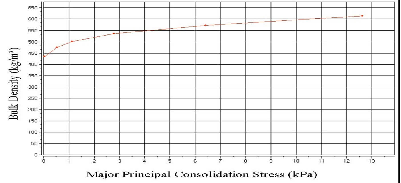 Figure 3 shows the bulk density of the material at different levels of consolidating stress. This graph tells us that the baby formula has a fill density of about 440 kg/³ and rises to about 620 kg/m³ at around 12.5 kPa of consolidating stress. In general, a free flowing powder will show very small changes in bulk density, whilst a cohesive or poor flowing powder will generally show a large increase in bulk density.