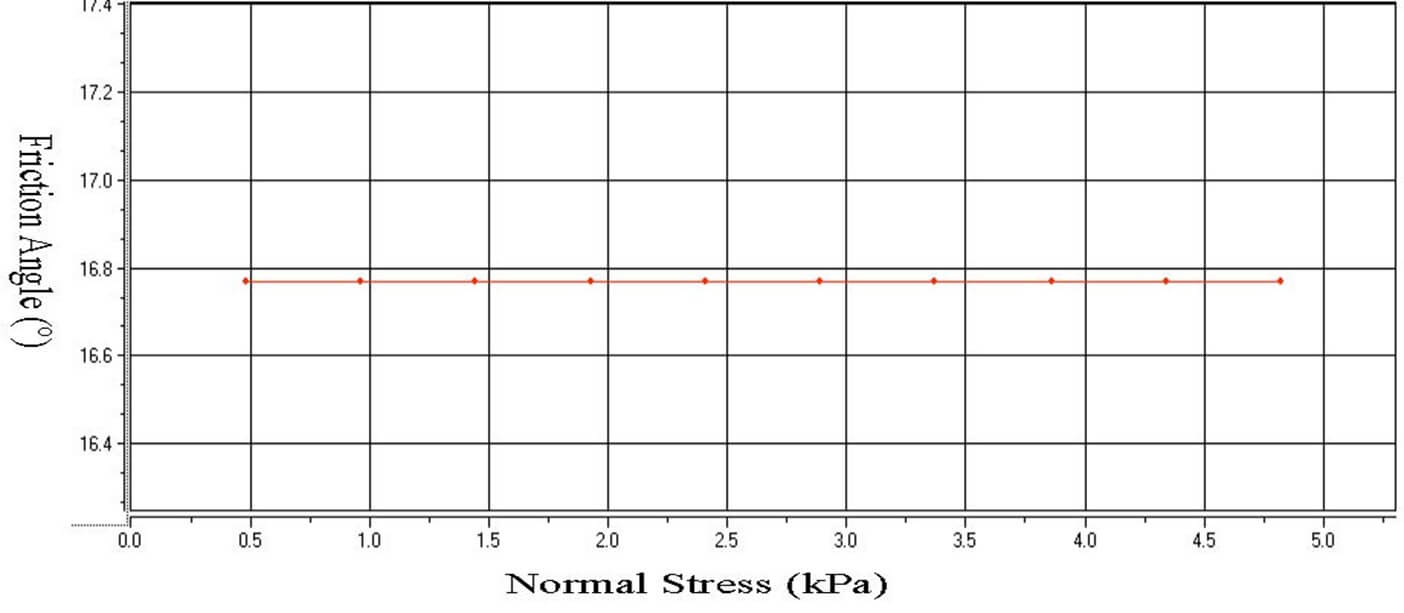 Figure 2 represents the angles of wall friction at different levels of normal stress. Angles of wall friction represent the friction between the sliding powder and the wall of the hopper or chute at the onset of flow. In this test a stainless steel lid was used, illustrating what the friction would be like if the baby formula was in a stainless steel hopper. The effective angle of wall friction for this powder remained at a static 16.75° throughout all levels of normal stress.