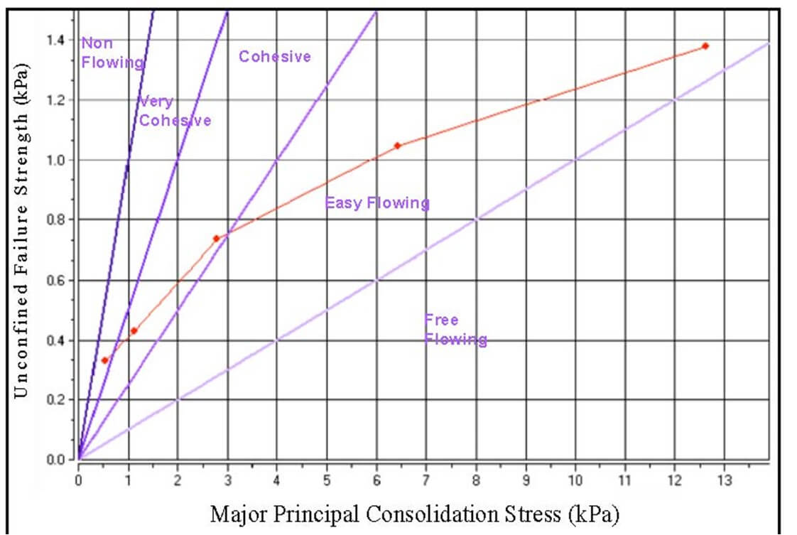 Figure 1 shows the flowability of the baby formula at different levels of consolidating stress. These results show that the baby formula is generally easy flowing except at low levels of consolidating stress where it begins to fall into the cohesive and very cohesive range (below 3 kPa).
