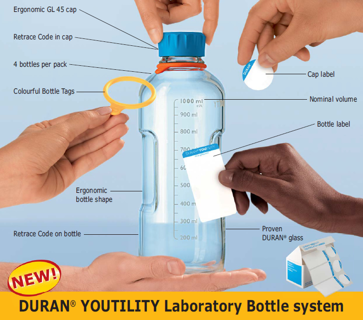 - A pre-defined labelling area is compatible with the dedicated DURAN® self-adhesive YOUTILITY bottle labels.