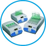 For controlled dry heating of test tubes, microplates and Eppendorf tubes in interchangeable aluminium blocks. The following models are available: