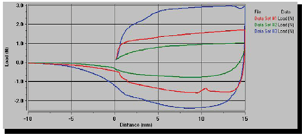 The softest of the three yoghurts tested is shown by the green curve. Very little load stress is shown at the start of the test due to the lack of a steep slope, and the minimal load force points to a product with low viscosity that can be readily dragged over the tongue.