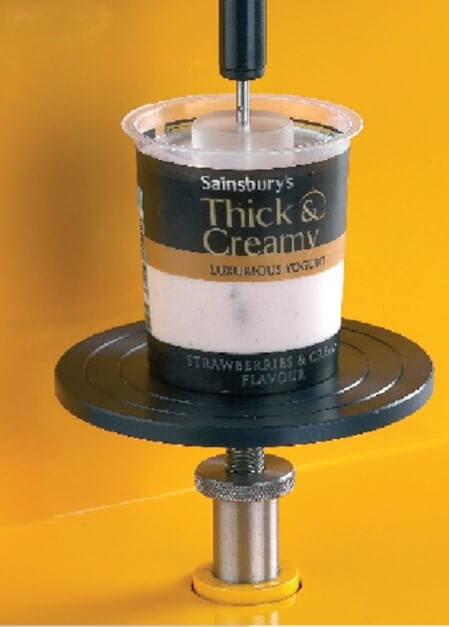 Three production lines are used by one premium dessert maker to create somewhat similar but distinct yoghurt items. The unique quality that set these sweets apart from their rivals was thought to be their mouthfeel. By dragging the product across the tongue, the product is sensory tested for mouthfeel. They wanted to ensure this level of excellence. The closest simulation of the mouth-feel procedure is a back extrusion test using a Texture Analyser. The rear extrusion test has the benefit of allowing the product to be tested in its retail container. As an alternative, the back extrusion test may be carried out using specialised accessory fixtures for texture analysers. Figure 2 shows a sample going to undergo a conventional back extrusion test.