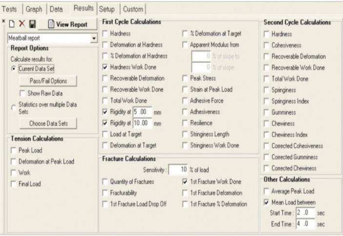 Texture Analyser Screen Shows Choices for Measured and Calculated Values