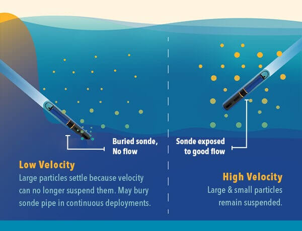 Water quality instruments do not require a particular flow rate to collect meaningful data but there are some key velocity-based judgments to take into consideration. If an instrument is installed in an area of no-to-low flow, it could experience increased sedimentation and biological growth during long-term deployments.