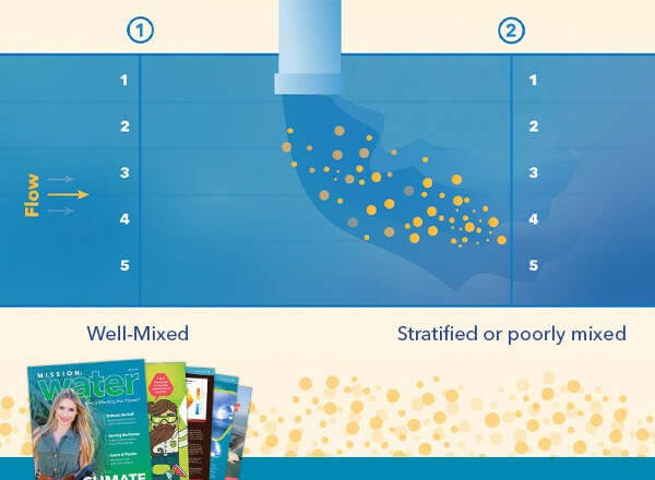 Stratification (layers of water with different chemical/physical properties) and poor mixing can tell a story about changes in the water body, but for the most accurate water quality study, sampling should be done at a well-mixed location. If monitoring is to occur in one of these types of locations, it is recommended to monitor more frequently or add additional equipment to keep track of conditions.